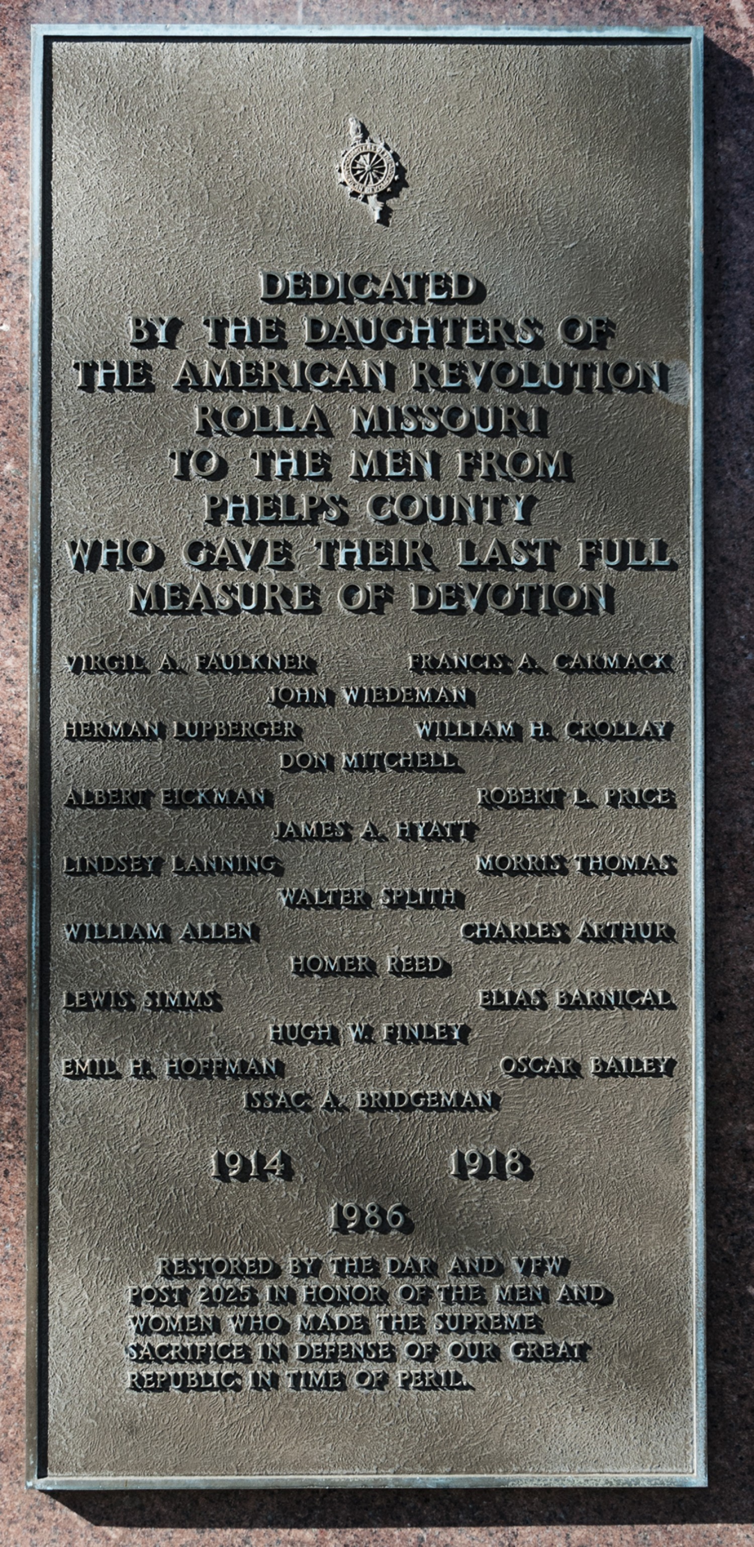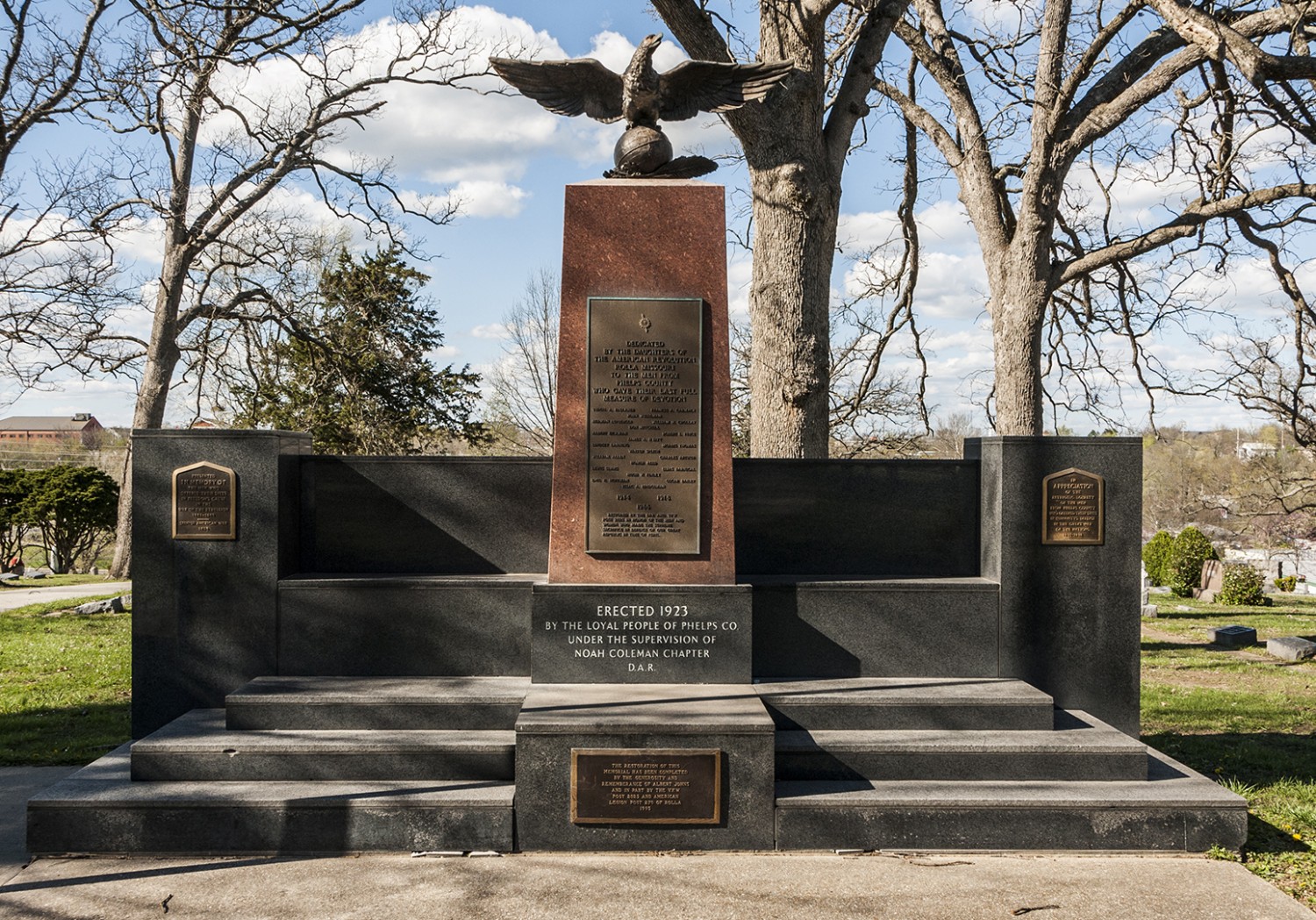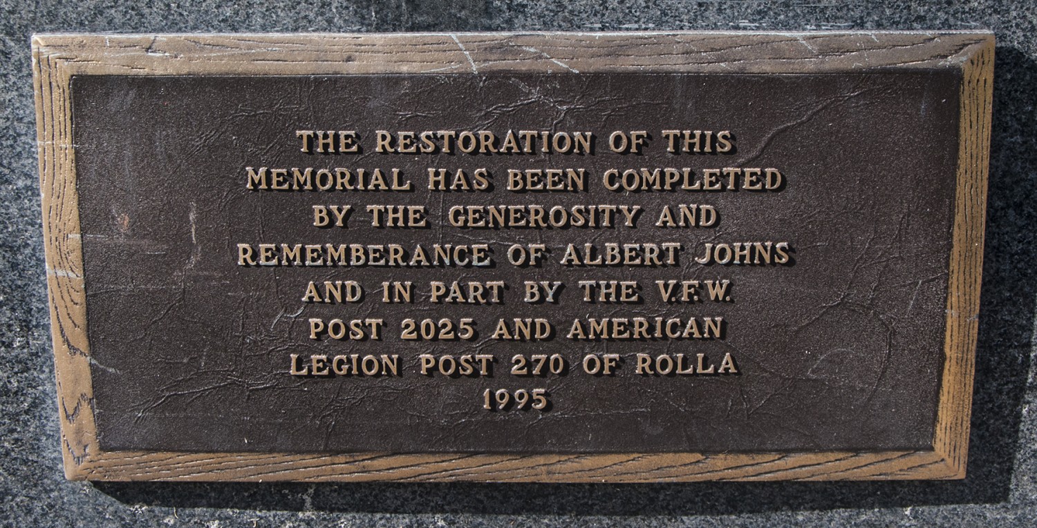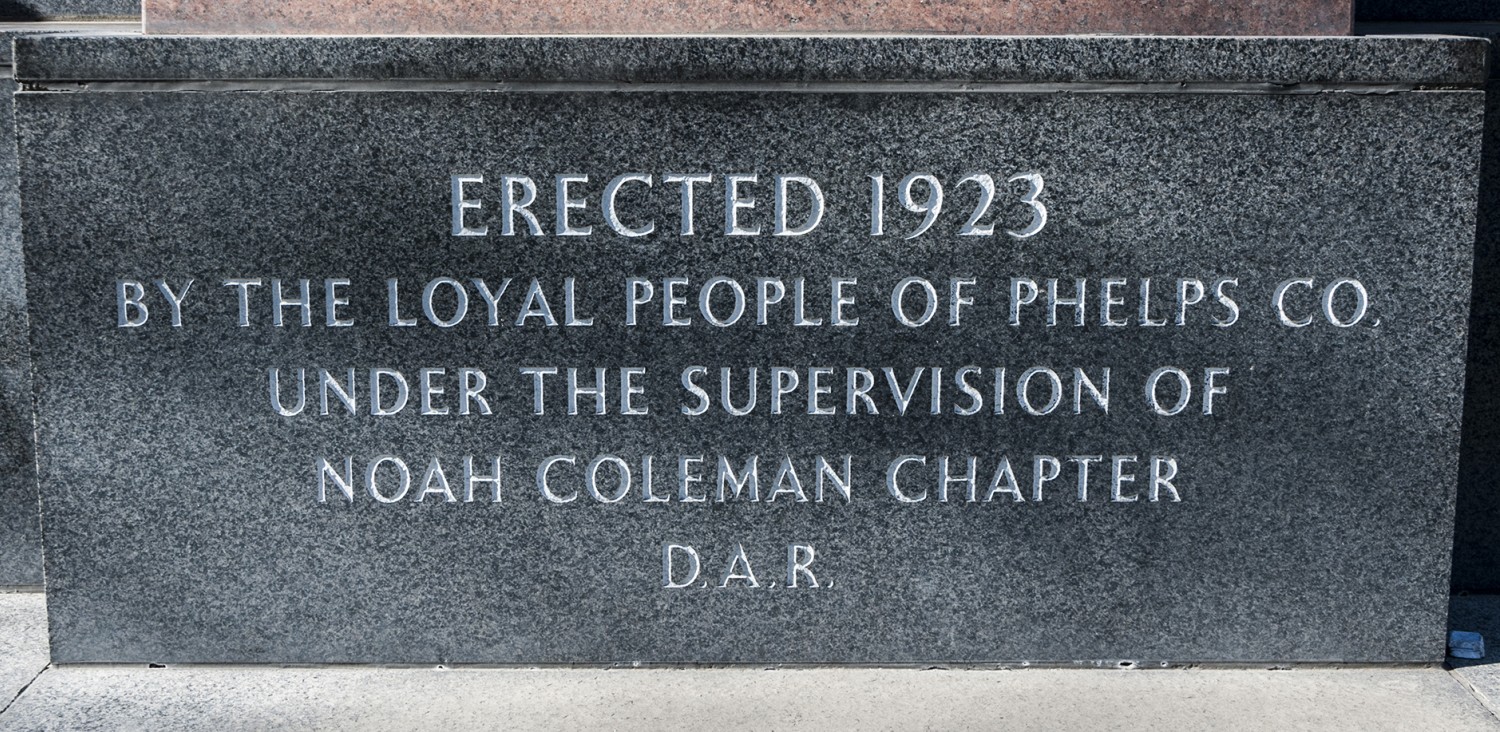 Originally erected in 1923 by the people of Phelps County under the supervision of Noah Coleman Chapter of the Daughters of the American Revolution, this large monument to Phelps County WWI Veterans has undergone several restorations, but today stands in striking contrast other WWI era memorials that have degraded dramatically. The monument consist of a large pink granite pillar in the center, with a bronze plaque on its face, topped by a bronze eagle, and flanked by smaller dedication plaques.