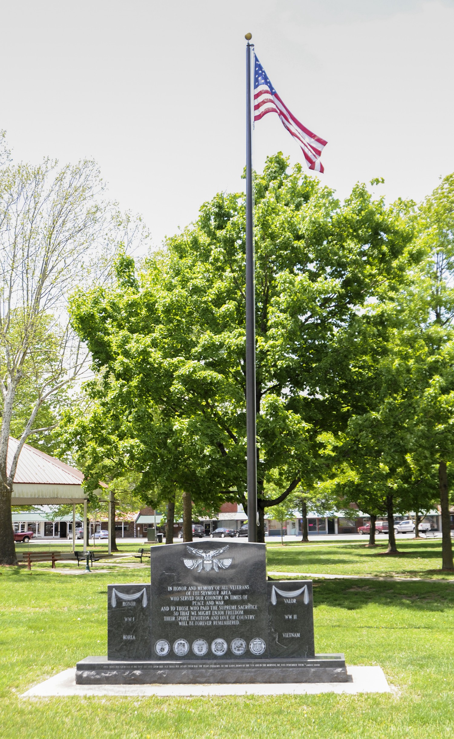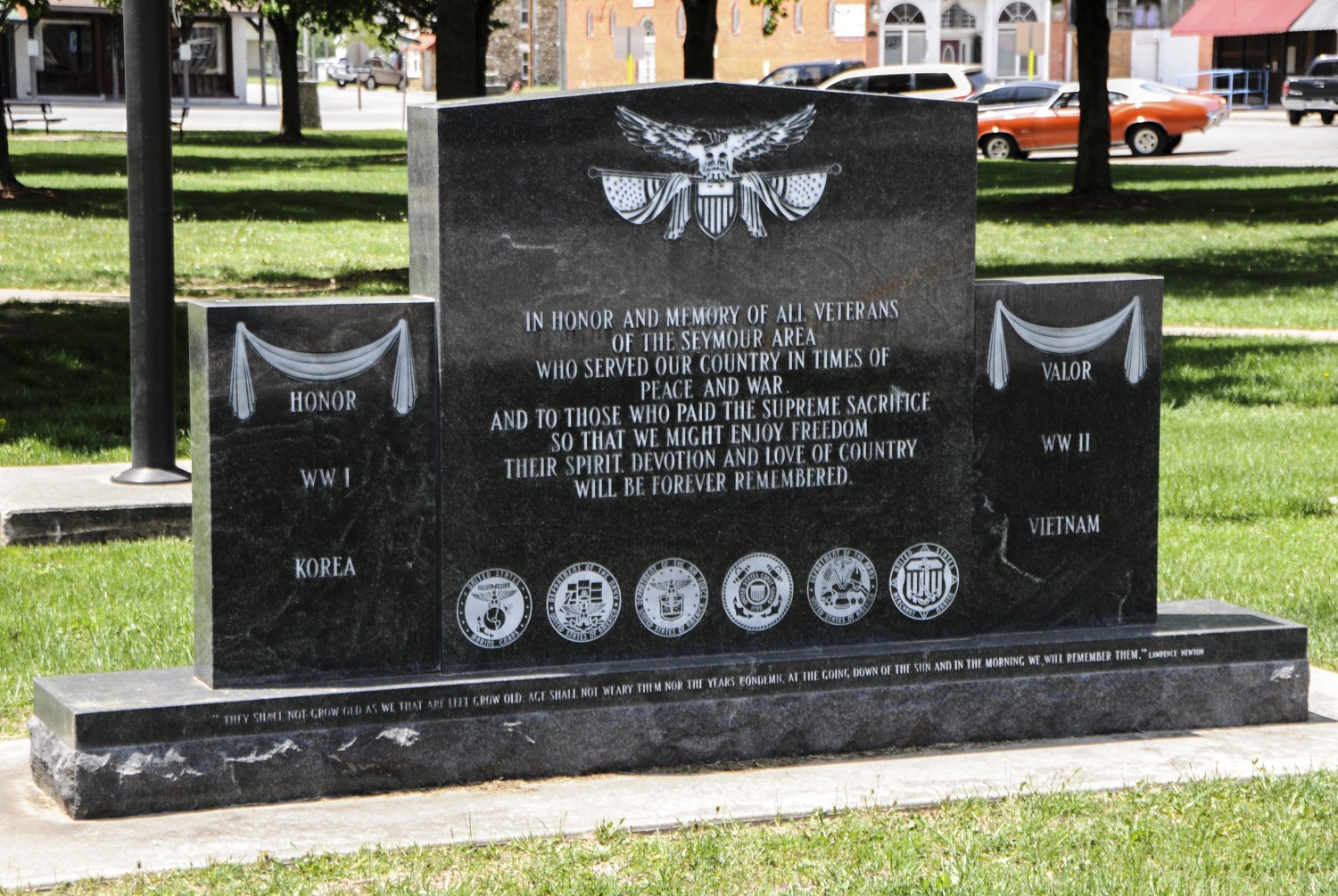 This memorial is dedicated "In honor and memory of all veterans of the Seymour area who served our country in times of peace and war. And to those who paid the supreme sacrifice so that we might enjoy freedom their spirit devotion and love of country will be forever remembered. A quote from Lawrence Newton at the bottom of the monument reads, " They shall not grow old as we that are left grow old. Age shall not weary them nor the years condemn, at the going down of the sun and in the morning we will remember them". This monument is located at a large public sqaure with a pavillion near the Seymour Police Department at 124 W Washington St, Seymour, MO 65746.