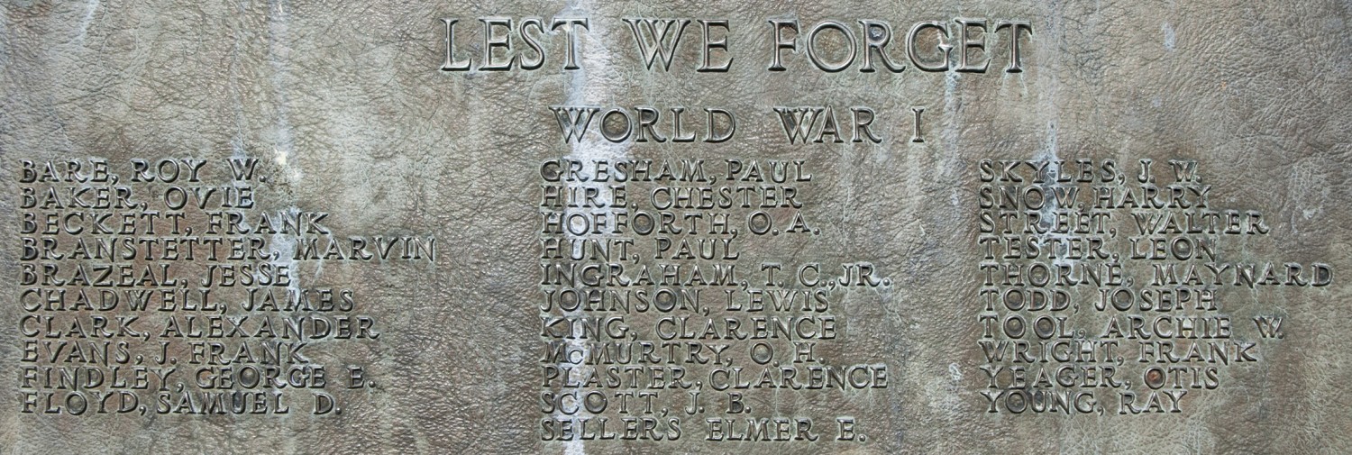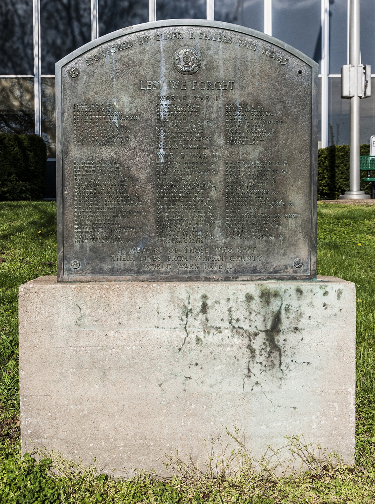 This bronze plaque set into stone commemorates the service of Wright County Veterans of foreign wars. The names of the deceased from each conflict are embossed on the plaque. The plaque originally commemorated the service of only the Veterans of World Wars, but Veterans from later conflicts were added to memorialize their service as well, including one Wright County resident whos life was taken during the 9/11 attack.