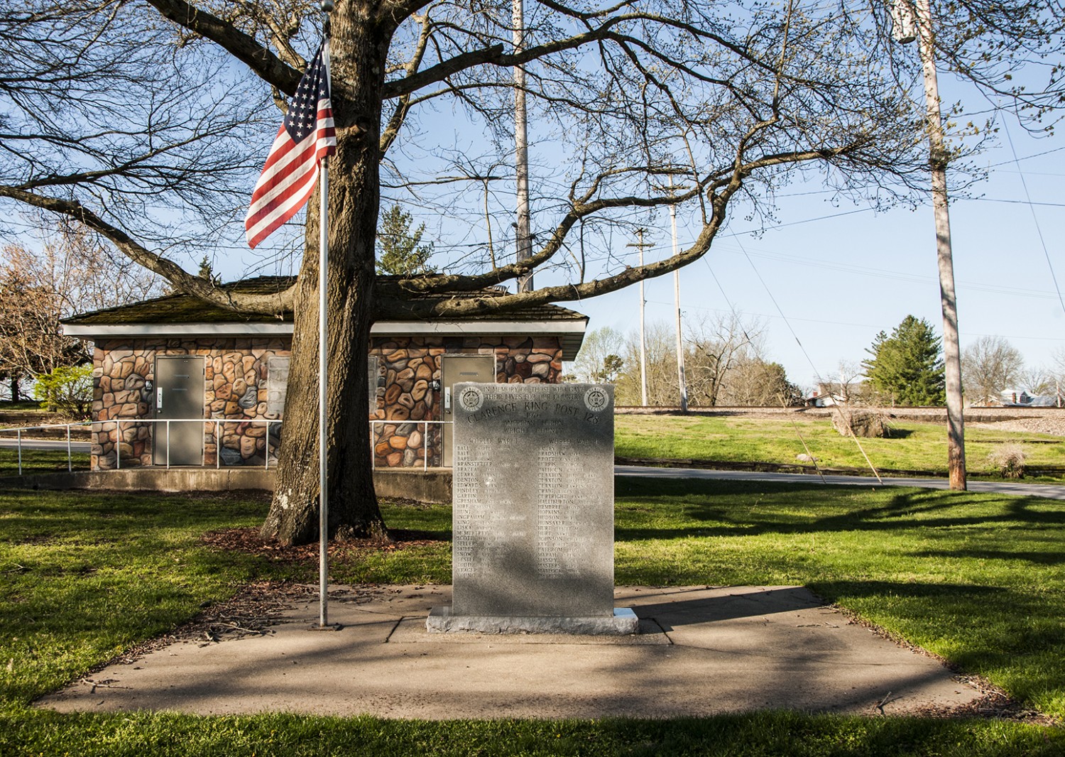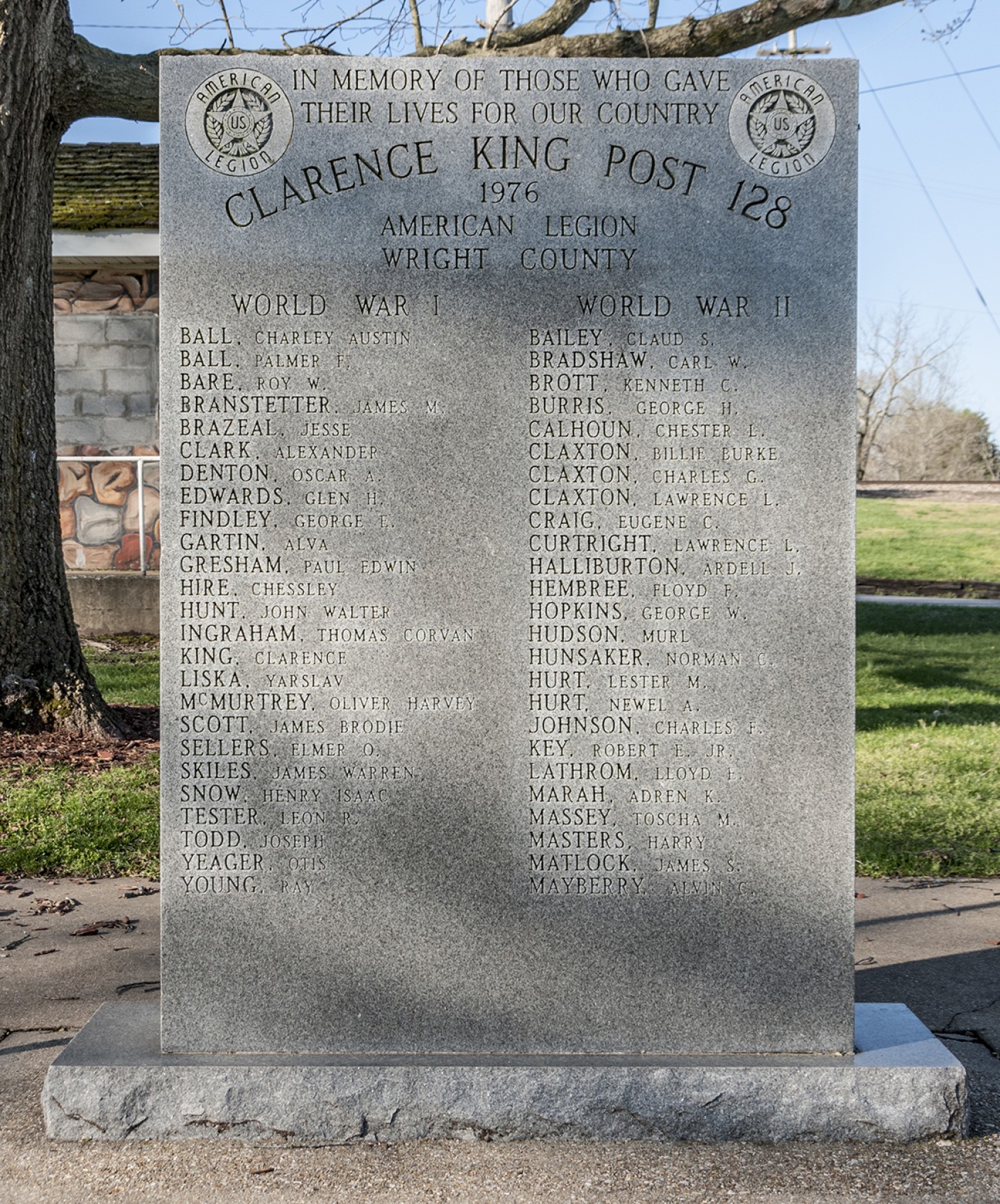 In Mansfield, Missouri stands a stone monument in memory of Wright County Veterans who gave their lives in foreign wars. It was dedicated in 1976 by the Clarence King American Legion Post No. 128. The park where this memorial stands is also home to a number of other public memorials and sculptures, including a bust of Mansfield’s most famous residents, Laura Ingalls Wilder.